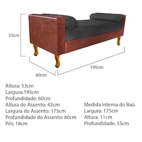Com uma estrutura e beleza única, o Recamier Félix se adapta em qualquer ambiente, tornando-o ainda mais elegante e harmonioso. Um Recamier luxuoso de alta qualidade, dará um toque especial em seu ambiente. Não perca essa oportunidade de levar mais charme e requinte ao seu cômodo, adquira já o seu! Especificações Técnicas do Recamier Félix: - Altura: 53 cm; - Largura: 195 cm; - Profundidade: 60 cm; - Altura do Assento: 42 cm; - Largura do Assento: 175 cm; - Profundidade do Assento: 60 cm; - Altura dos Pés: 18 cm; - Peso: 35 kg. - Peso Suportado: 220 kg. Medida Interna do Baú: - Altura: 11 cm; - Largura: 175 cm; - Profundidade: 55 cm; Diferenciais do Recamier Félix: - Material da Estrutura: fabricado com Madeira Pinus e Eucalipto Reflorestada, e alguns detalhes em MDF; - Tipo de Assento: estofado e com espuma de densidade D-26; - Tipo de Encosto: estofado e com espuma de densidade D-18; - Detalhes do Tecido: possui detalhes em botonê, onde os botões são revestidos no mesmo tecido do produto e finalizados com excelente acabamento; - Detalhes dos Pés: acompanha kit de pés (4 pés) de madeira, no estilo Luís XV, com alta resistência; - Volumes: nessa compra você receberá um único produto. Recomendações de limpeza: -Limpar com flanela limpa e seca. Não molhar o móvel e não expor em lugar úmido ou próximo de fontes de calor. Não usar produtos abrasivos.