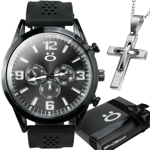 Características Principais: - Marca: Orizom Spaceman - Tipo: Analógico - Cor: Preto - Maquinário: Aço Inoxidável com Pintura Eletrostática Preta Black Piano - Pulseira: Silicone Ajustável - Tampa Blindada com Arte Exclusiva da Linha Spaceman - Material da Corrente: Aço Inoxidável - Comprimento da Corrente: 60cm - Pingente: Cruz em Aço Inoxidável com Gravação a Laser da Oração do Pai Nosso