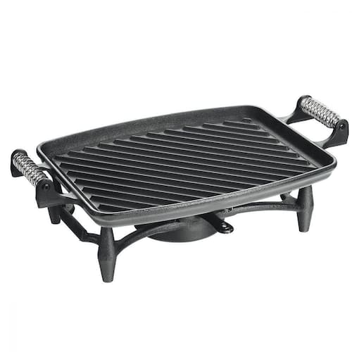 Chapa Grill com 33 cm comprimento x 25 cm largura, essa medida corresponde somente a área útil da chapa, ou seja, não inclui as alças. Chapa com estrias para preparar deliciosos grelhados e canaleta que armazenam os líquidos para deixar o centro mais aquecido. A chapa também pode ser utilizada em todos os tipos de fogão. Alças em Espiral. Fogareiro todo em ferro fundido, a álcool com regulador de chama, base em peça única que facilita o manuseio. Fogareiro atinge temperatura suficiente para esquentar a chapa e preparar a carne mesmo crua. Todo em ferro fundido esse réchaud tem durabilidade imensurável, e conserva por mais tempo o calor. Muito utilizado por bares, restaurantes e hotéis para servir porções e mantê-las aquecidas. Material feito de Ferro Comprimento: 33 cm Largura: 25 cm Alça: Espiral Peso: 5,2 kg Código: 19304