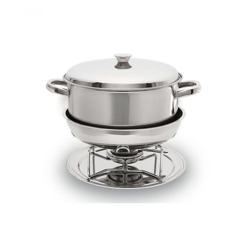 Rechaud Com Banho Maria 5,7 Litros - Platanos - Brinox O Rechaud Plátanos tem Caçarola Funda e Tampa de Aço Inox, um material higiênico e neutro, ideal para ser utilizado em contato com os alimentos. Possui capacidade para 5,7 Litros e vem com um Suporte Cromado, um Fogareiro de Aço Inox Grande e com Abafador e uma Cuba para Banho Maria. Tudo isso sobre um Prato de Aço Inox com 32 centímetros de diâmetro. Um conjunto completo para servir a comida aquecida e com muita elegância. Material - Inox e Vidro Linha - Plátanos Tipo de Produto - Servir Composição - 01 Caçarola Funda com Tampa01 Suporte Cromado01 Fogareiro Aço Inox Grande com Abafador01 Prato 32 cm01 Cuba para Banho Maria 27 cm Dimensões - 32,6x33,2x14,6 cm CxLxA Peso - 2458 g Garantia - 90 dias para vícios ou defeitos de fabricação.