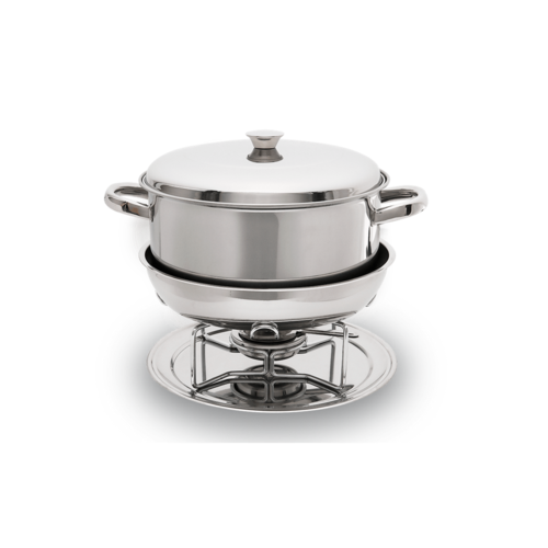 O Rechaud Plátanos tem Caçarola Funda e Tampa de Aço Inox, um material higiênico e neutro, ideal para ser utilizado em contato com os alimentos. Possui capacidade para 8 Litros e vem com um Suporte Cromado, um Fogareiro de Aço Inox Grande e com Abafador e uma Cuba para Banho Maria. Tudo isso sobre um Prato de Aço Inox com 30,5 centímetros de diâmetro. Um conjunto completo para servir a comida aquecida e com muita elegância.