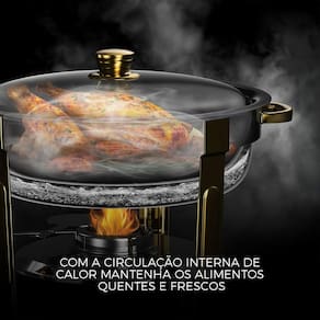 Funcionalidade e Elegância Este rechaud não é apenas visualmente atraente; ele também mantém suas refeições na temperatura ideal, preservando a qualidade e o sabor. O conjunto inclui um fogareiro de aço inox eficiente, garantindo que seus pratos permaneçam aquecidos durante todo o evento. Informações Gerais