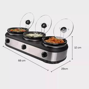 O Triplo Buffet Inox Member's Mark e a solucao ideal para quem busca versatilidade, praticidade e elegancia na cozinha. Com capacidade total de 7,2 litros, permite preparar ate 3 pratos diferentes simultaneamente, mantendo os alimentos quentes por horas, com controle total de temperatura.
