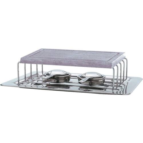 Bandeja de aço inox medindo 29 x 43 cm + suporte em aço cromado + pedra sabão medindo 33 x 22 cm + 2 queimadores de alcool em aço inox.