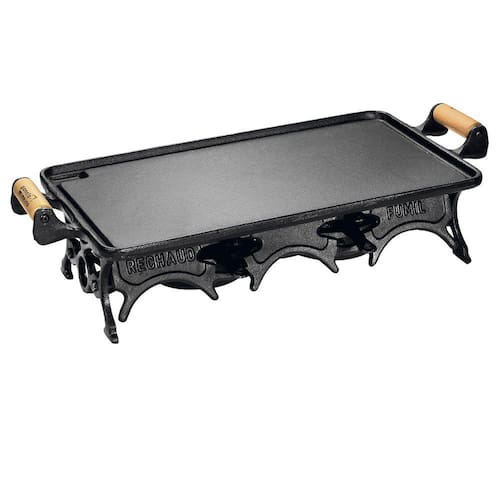 Chapa lisa com 46 cm comprimento x 25 cm largura, essa medida corresponde somente a área útil da chapa, ou seja, não inclui as alças. Chapa lisa com canaleta nas bordas que armazenam os líquidos para deixar o centro mais aquecido. Ideal para preparar carnes, legumes, vegetais, peixes A chapa também pode ser utilizada em todos os tipos de fogão. Alças de madeira Possui 02 Fogareiros todo em ferro fundido, a álcool com regulador de chama e base desmontável, com abas laterais para proteger do vento. Fogareiro atinge temperatura suficiente para esquentar a chapa e preparar a carne mesmo crua. Todo em ferro fundido esse rechaud tem durabilidade imensurável, e conserva por mais tempo o calor. Muito utilizado por bares, restaurantes e hotéis para servir porções e mantê-las aquecidas.enha, elétrico e também em cooktop de indução.