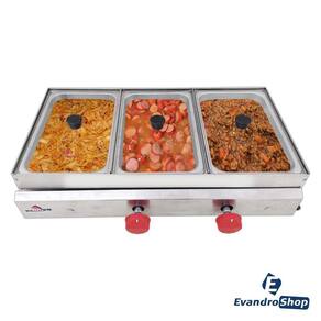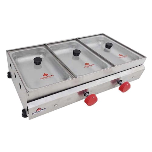 Esta molheira foi fabricada especialmente para manter alimentos como ensopados, risotos, molhos, legumes, cremes entre outros sempre aquecidos. É indispensável em buffets, restaurantes, pousadas, hotéis e similares. Confeccionada aço inox escovado, esta molheira é durável e super fácil de limpar. Dispõe de três cubas fabricadas em aço inox com capacidade de 1,5 litros cada, sendo que as cubas da direita e do centro são quentes e a esquerda é temperatura ambiente. Suas cubas possuem tampa de vidro reforçado com pegador ergonômico. Seu funcionamento é a gás em baixa pressão, dispondo de um queimador, onde a chama pode ser regulada entre mínimo e máximo, através do botão localizado na frente do equipamento. Para melhor alocação e fixação, este equipamento possui pés de borracha removíveis. Adquira um produto prático, compacto, que irá diminuir a perda ou desperdício de alimentos em seu estabelecimento, otimizando processos, melhorando o nível de segurança e qualidade dos mesmos, proporcionando uma maior rentabilidade, além de ter vida útil extensa, compensando a longo prazo o seu investimento Características técnicas: Material: aço inox escovado Alimentação: gás Consumo: 0,200 kg/h Pressão: baixa pressão Quantidade de queimador: 02 Quantidade de cuba: 03 02 quentes // 01 temperatura ambiente Capacidade da cuba: 1,5 litros Dimensões da cuba: 05x18,5x28,7 cm Material das tampas das cubas: vidro temperado Espessura do vidro das tampas: 0,4 mm Altura com as tampas das cubas: 06 cm Altura sem as tampas das cubas: 05 cm Largura: 59 cm Profundidade: 31,5 cm Peso: 5,500 kg Marca: progas Modelo: pr-03g Garantia: 6 meses