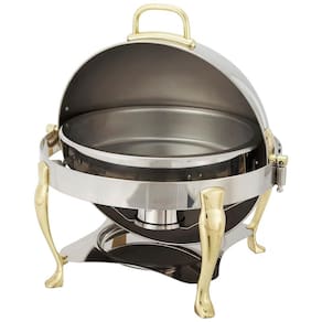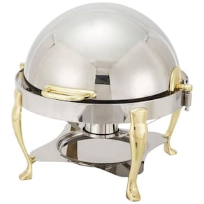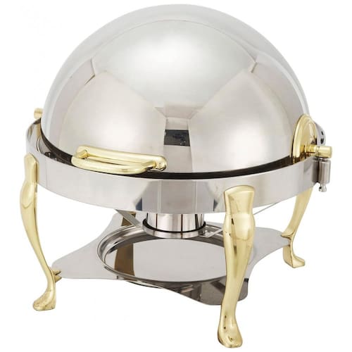 Redondo contém 6 L, ideais para servir uma variedade de pratos A tampa do rolo desliza facilmente para fora do caminho para facilitar a manutenção e o reabastecimento e abre para 90 ou 160 Serviço pesado Feito de aço inoxidável de qualidade , projetado para suportar o uso diário em ambiente perfeito para restauração, hotéis, salas de banquetes e muito mais Acabamento do espelho Aço inoxidável polido com detalhes dourados adiciona sofisticação sutil, tornando este chafer ideal para qualquer local Inclui chasser 1 com suporte, 1 panela redonda de 6 litros, 1 panela de água e suportes de combustível 1 Marca: Não Informado