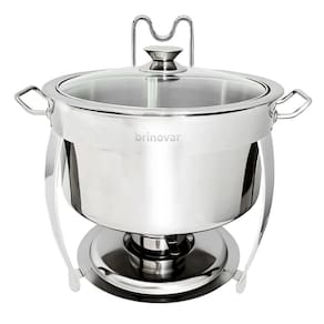 Kit com 2 unidades O Rechaud Redondo 8 Litros Brinovar tem a estrutura e o fogareiro em Aço Inox: altamente durável, resistente e fácil de limpar. Possui a tampa em vidro temperado, com saída de vapor. Vem com um prático apoio para tampa. A da cuba é muito simples, podendo ser realizada durante o uso do produto, sem prejudicar o serviço Medidas da Cuba de Comida: 28cm de Diâmetro por 14cm de Altura 8 Litros Medidas da Cuba de Água: 29,5cm de Diâmetro por 16cm de Altura Medidas do Rechaud Montado: 39cm de Largura por 35cm de Altura Capacidade: 8 Litros. Peso: 5949 g Recomendações de Uso: Esta peça contém bordas cortantes. Manusear com cuidado. Não usar ácido muriático, água sanitária ou qualquer outro solvente. Enxaguar e secar bem a peça após o uso. Nunca deixar objetos metálicos sobre a peça por períodos muito longos, para evitar a corrosão. Para manter o brilho do seu rechaud, recomendamos o uso da pasta para polir e remover manchas em superfícies de aço inoxidável. Itens Inclusos: 01 Rechaud 01 Cuba para Comida 01 Cuba para Água 01 Tampa de Vidro com Respiro 01 Fogareiro 01 Suporte Traseiro para Tampa Marca: Não Informado