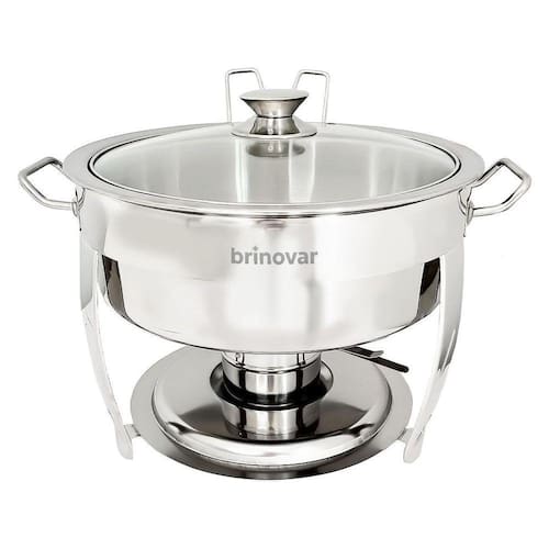 O Rechaud Redondo 5 Litros Brinovar tem a estrutura e o fogareiro em Aço Inox: altamente durável, resistente e fácil de limpar. Possui a tampa em vidro temperado, com saída de vapor. Vem com um prático apoio para tampa. A substituição da cuba é muito simples, podendo ser realizada durante o uso do produto, sem prejudicar o serviço