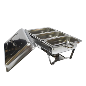 Rechaud 11L com 3 cubas GN 1/3. Ideal para servir três alimentos diferentes mantendo sabor e temperatura com elegância.