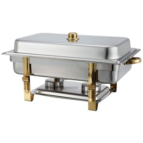 O Rechaud de tamanho normal da série Winco 201 Malibu é ideal para fornecedores em movimento. Os clipes embutidos mantêm as tampas no lugar para enchimento e recarga convenientes. Este chafer resistente contém uma mesa de vapor de tamanho normal de 8 litros, panela de hotel ideal para servir uma variedade de alimentos. A construção em aço inoxidável resistente foi projetada para suportar o uso diário em um ambiente , tornando o o forro perfeito para catering, hotéis, salões de banquetes e muito mais. As pernas reforçadas garantem a máxima estabilidade, enquanto o aço inoxidável polido espelhado com detalhes dourados adiciona uma sofisticação sutil.