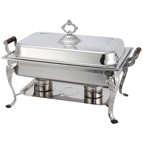 Construção em aço inoxidável 18, 8 com acabamento espelhado Capacidade total de 8 litros Inclui bandeja de água, bandeja de comida, tampa de cúpula e 2 suportes de combustível com tampas Forma retangular elegante Detalhes em madeira para puxadores