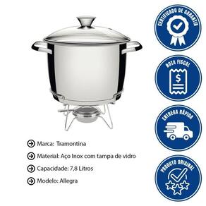 - Com o Rechaud Tramontina em Aço Inox Fundo Triplo com Fogareiro e Tampa de Vidro 7,8 L da linha Allegra ficará ainda mais prático de proporcionar suas receitas para os convidados.