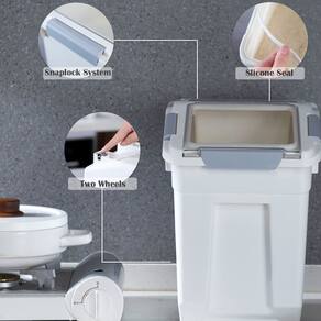 Este recipiente de armazenamento de alimentos é feito de material PP de grau alimentício, livre de BPA. É ideal para armazenar arroz, farinha, milho, feijão, alimentos secos para animais de estimação, etc. A capa hermética de silicone selada com uma tampa flip e 6 travas mantém os alimentos frescos e seguros e evita umidade e poeira. Ele é projetado em cinco tamanhos disponíveis para você escolher a melhor opção conforme necessário. O recipiente de armazenamento pode ser utilizado como um armazenador de arroz/grãos, armazenamento de despensa, recipiente de ração para animais de estimação para ração de cachorro, comida de gato ou semente de pássaros, bem como uma caixa de armazenamento para brinquedos, coleira, areia de gato, etc. - Este recipiente de armazenamento de alimentos é feito de material PP livre de BPA, vem com um copo de servir. - Capa hermética de silicone selada com uma tampa dobrável e 6 fechaduras: mantenha arroz, farinha, milho, feijão ou alimentos secos para animais de estimação frescos e saudáveis. É à prova de umidade, poeira e não vazamento. - 33 litros - 29 cm L x 44 cm x 40 cm A, comporta aproximadamente 22,7 kg de arroz ou 16 kg de ração seca para animais de estimação. - O design com pequeno sulco sob a tampa para uma pequena cesta, que é para colocar o "anis estrelado seco" ou "absorvente de umidade" (vendido separadamente) para proteger os alimentos de pragas e manter frescos. - Uma alça e quatro rodas: um design para facilitar o movimento e armazenamento.