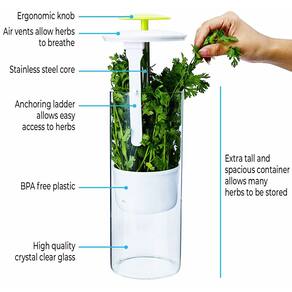 Pare de desperdiçar seu dinheiro com produtos podres Todos nós já passamos por aí: uma geladeira cheia de produtos que queremos usar, apenas para encontrar o produto apodrecendo ou ruim quando quisermos usá-lo. Felizmente, agora com nosso protetor de ervas, você não precisa mais fazer isso. Herb Keepers e recipientes de armazenamento de ervas Os protetores de ervas permitem que você mantenha seus produtos frescos por até 4 vezes mais tempo. O recipiente grande permite que o ar circule ao redor do produto e a água na parte inferior mantém o produto vivo. O dispositivo pagará por si mesmo com apenas um mês de uso! Por que Tenten Labs? Nosso Herb Keeper foi projetado na Dinamarca. É o maior detentor de ervas na Amazon (12 cm de diâmetro e 28 cm de altura) e armazena quase o dobro da quantidade de outros recipientes de armazenamento de ervas. O vidro borossilicato, o núcleo de aço inoxidável e o copo interno sem BPA passam por inúmeras verificações de qualidade antes de chegar até você. Importante: Devido ao tamanho grande do detentor de ervas, meça sua geladeira para garantir que o protetor de ervas sirva antes de comprar Como manter suas ervas frescas Passo 1: Levante o copo interno e fixe-o no vidro. Passo 2: Despeje água até a linha "MAX". Passo 3: Coloque ervas dentro do protetor de ervas no copo interno. Passo 4: Abaixe o copo interno de volta no protetor de ervas. Passo 5: Guarde o Herb Keeper dentro da geladeira. Desfrute de ervas como você acabou de comprá-las. NOSSA PROMESSA PARA VOCÊ Faremos o nosso melhor para consertar as coisas e colocar um sorriso de volta no seu rosto. - Tamanho 2GG: 12 cm de diâmetro, 31 cm de altura. Meça sua geladeira antes de comprar! - Economize $$$: As ervas se tornaram caras devido à inflação. Nosso protetor de ervas hidrata e protege verduras e mantém os vegetais frescos por até 3 semanas. Perfeito para aspargos, salsa, coentro, endro, alecrim, menta, estragão, couve e centenas de outras ervas. - Design elegante: minimalista e progressivo. Interior de vidro alto e espaçoso com núcleo de aço inoxidável. O copo livre de BPA permite um fluxo de ar respirável que maximiza a longevidade das ervas. Presente perfeito para chefs e cozinheiros. - Compre com confiança: temos uma garantia vitalícia. Nosso atendimento ao cliente é lendário. - O único autêntico: Descubra por que mais de 25 mil clientes em todo o mundo amam seu NOVART herb keeper. Existem muitas cópias genéricas do nosso detentor de ervas, mas nenhuma que possa resistir à qualidade e funcionalidade do selo NOVART de aprovação.
