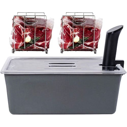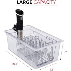 * Kit de grande capacidade: Conjunto de contêineres/prateleiras/tampa/manga isolante de 26 litros serve para 10 bifes ou peitos de frango, bem como cortes grandes como peito inteiro, que você não pode espremer em 12 litros. Perfeito para famílias grandes, festas, kichens comerciais. * A manga isolante reduz o tempo de cozimento: nossa luva isolante de neoprene lavável evita que o calor escape, o que significa que seu recipiente aquece mais rápido e a temperatura é superestável para resultados de cozimento de precisão. A capa também evita arranhões e rachaduras relacionadas ao calor na sua bancada. * RACKS ELIMINAM A FLUTUAÇÃO E O DESLIGAMENTO: Nossas prateleiras ajustáveis de aço inoxidável criam espaço de circulação entre os sacos e a barra transversal extra larga evita flutuar, garantindo que seus alimentos cozinhem uniformemente de todos os lados. * A tampa evita a evaporação: Pare de definir um alarme para encher a água durante a noite em cozinheiros longos. Nossa tampa personalizada mantém seu nível de água cheio. Chega de risco de alimentos expostos levando a desastres semi-cozidos! * Serve para a maioria dos dispositivos: a abertura da tampa de 6,3 cm serve para Nano, Anova, Joule e a maioria dos fogões. Detalhes do produto: Recipiente Sous Vide 52 x 33 x 20 cm = 26 litros de capacidade. Policarbonato durável cristalino - resistente ao calor - projetado para suportar facilmente 210 F, ainda mais resistente do que você precisa! Tampa com abertura para circulador Abertura de 6,3 cm - funciona com a grande maioria dos fogões - Nano, Anova, Joule. Testes de 24 horas mostram grande redução na perda de água por evaporação em comparação com a ausência de tampa. 2 suportes ajustáveis com barra transversal. Aço inoxidável = chega de prateleiras enferrujadas! Espaçadores ajustáveis criam 5 compartimentos para bolsas - adequado para sua comida. Manga isolante Neoprene trava no calor, estabilizando a temperatura de cozimento para resultados sem preocupações. Compre agora e nb - ? Grande capacidade – Kit de 26 litros de recipiente/prateleiras/tampa/manga isolante serve para 10 bifes ou peitos de frango e cortes grandes como peito inteiro que você não pode espremer em 12 litros. Perfeito para famílias grandes, festas, cozinhas comerciais. - ? A manga isolante garante a distribuição de calor: nossa luva isolante de neoprene lavável evita que o calor escape, o que significa que seu recipiente aquece mais rápido e a temperatura é superestável para resultados de cozimento de precisão. A capa também evita arranhões e rachaduras relacionadas ao calor na sua bancada. - ? As prateleiras eliminam a flutuação e a embola: nossas prateleiras ajustáveis de aço inoxidável criam espaço de circulação entre os sacos e a barra transversal extra larga evita flutuar, garantindo que seus alimentos cozinhem uniformemente de todos os lados. - ? A tampa evita a evaporação: pare de definir um alarme para encher a água durante a noite em cozinheiros longos. Nossa tampa personalizada mantém seu nível de água cheio. Chega de risco de alimentos expostos levando a desastres semi-cozidos! - ? Cabe na maioria dos dispositivos: a abertura da tampa de 6,3 cm serve para Nano, Anova, Joule e a maioria dos fogões.