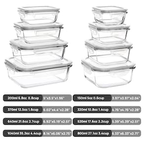- ?Conjunto de 8 recipientes de armazenamento de vidro?Retângulo (995 g)+(612 g)+(354 g)+(142 g); quadrado (768 g)+(499 g)+(306 g)+(192 g); recipientes grandes e pequenos são versáteis para diferentes utilizações: comida de preparação de refeições, sobras, molho, almoço para viagem, trailer, piquenique, acampamento.