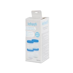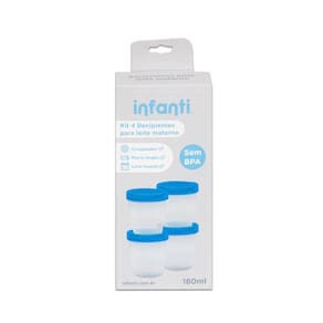 O kit é composto por 4 potes com tampa de 180 ml cada. Desenvolvidos para que os pais tenham muito mais praticidade e segurança no cuidado com a alimentação das crianças, em especial na fase de lactação. O kit de recipientes para leite materno da Infanti é ideal para armazenar, congelar e descongelar o leite materno de maneira higiênica, preservando sua pureza e características.