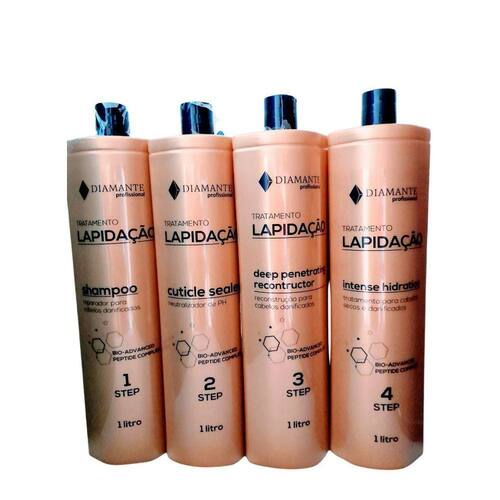 Contém 4 passos de 1 litro cada.Passo 1 - shampoo de 1 litro para cabelo danificado tanto fino como grosso,Passo 2 - selador de cutículas tratamento neutralizar suaviza e sela a cutícula;Passo 3 -deep penetrating reconstrutor reconstrói de dentro para fora revitaliza os cabelos danificados e quimicamente processados restabelecendo seu ph natural deixando-os mais brilhantes, fortes saudáveis e maleáveis. Contém alta concentração de complexo quadraminico além do complexo pepditico Passo 4 - bio-avancado.Intense hidratar máscara de tratamento para os cabelos secos e danificados, hidrata profundamente e promove brilho e maciez.diamante profissional: o shampoo lapidação step 1 é o primeiro passo do tratamento; limpa suavemente, remove as impurezas dos fios e restaura a fibra capilar.A tecnologia do shampoo lapidação diamante restaura, fortalece e protege os fios, deixando-os maleáveis e mais saudáveis.Pode ser utilizado como shampoo de uso diário, proporcionando brilho, maciez e saúde para os seus cabelos.O cuticle sealer lapidação step 2 é o segundo passo do tratamento; suaviza e sela as cutículas, define mechas e protege a cor, além de equilibrar o ph para restaurar os cabelos de volta ao seu estado natural. Cuticle sealer também neutraliza qualquer resíduo de amônia, interrompe a oxidação dos fios, desembaraça e reduz a porosidade e a queda dos fios.Você está preparada para recuperação total dos seus cabelos Um único e completo cronograma capilar, que promove a regeneração total dos cabelos produto com 4 passos e muitos benefícios aos seus cabelos:Lapidação , reconstrução , hidratação profunda e prolongada .PromoveBrilho intenso , elimina o frizz , devolve nutrientes perdidos , retira metais pesados , alinhamento dos fios , restauração imediata , reparação de pontas duplas , toque aveludado , desembaraço , não deixa resíduo oleoso , trate de dentro para fora , selagem de cutícula e antioxidante . Lapidação , promove a reageneração completa dos fios UtilizePasso 1 shampoo , Passo 3 reconstrutor 5 minutos enxague Passo 2 selante 5 minutos enxague Passo 4 hidratante 5 minutos enxague .Para finalizar utilize o liso perfeito de preferênciaReconstrução, promove a reposição completa dos nutrientes perdidos com processos químicos Utilize Passo 1 shampoo , Passo 3 reconstrutor 5 minutos enxague Passo 4 hidratante 5 minutos enxague .Para finalizar utilize o liso perfeito de preferência Hidratação: promove maciez , brilho , maneabilidade incrível nos fiosUtilize Passo 1 shampoo , Passo 4 hidratante 5 minutos enxague .Para finalizar utilize o liso perfeito de preferênciaIndicação para um cronograma capilar completo Primeira etapa Utilize 2 x a lapidação passos 1,2,3,4 Utilize 2 x a reconstrução passos 1,3,4 Utilize 2x a hidratação passos 1,4 Segunda etapa Utilize 1 x a lapidação passos 1,2,3,4 Utilize 1 x a reconstrução passos 1,3,4 Utilize 1x a hidratação passos 1,4Terceira etapa Utilize 1x a lapidação passos 1,2,3,4 Utilize 2 x a reconstrução passos 1,3,4 Utilize 3x a hidratação passos 1,4Produto interno de cor branca