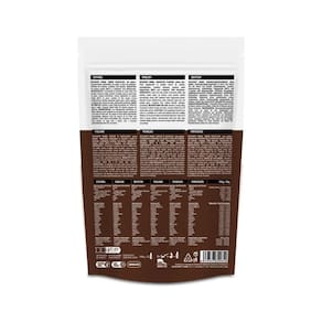 Suplemento alimentar em pó à base de proteína, hidratos de carbono, creatina, linhaça, triglicerídeos de cadeia média MCT e L-arginina. Com edulcorante.