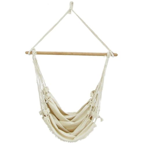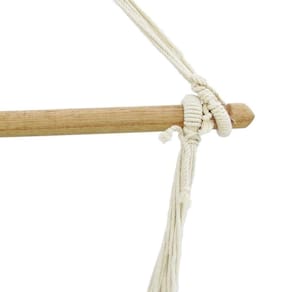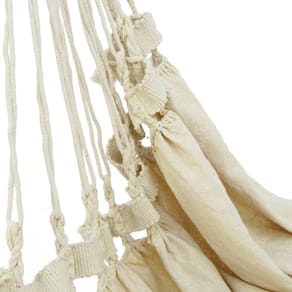 Feita de forma artesanal, a rede de cadeira é feita com 100% algodão tornando o material forte, firme, confortável e prático para higienização. E para aqueles que não querem furar teto, ou fixar ganchos, a rede cadeira proporciona uma vantagem de prendê-La com cordas. Largura do assento e também do encosto 72 cm Comprimento do assento e encosto 1,50 m Largura da madeira 4 cm Comprimento madeira 93 cm Altura total da cadeira 1,50 m Peso suportado 90 kg Peso total da cadeira com madeira 1,800 kg Com auxílio de cordas a cadeira pode ser facilmente instalada Não acompanha almofadas