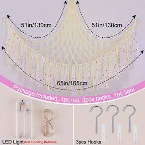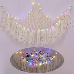 FIOBEE Rede ou rede de animais de pelúcia com luz de LED, rede de brinquedo pendurada para animais de pelúcia, organizador de armazenamento, decoração de quarto com borlas para berçário, sala de jogos, quarto de crianças - Armazenamento de animais de pelúcia pendurados: organizador de brinquedos decorado com borlas de renda coloridas e vem com cordão de luz LED que pode ser utilizado como luz noturna; o armazenamento da sala não apenas mantém os quartos das crianças mais organizados, mas também adiciona uma atmosfera acolhedora ao canto da sala - Economia de espaço: design de pendurar na parede, nossa rede de animais pode ser pendurada em um canto da parede, não ocupa espaço extra; mantém o quarto das crianças arrumado e espaçoso; ideal para berçário, pré-escola, sala de jogos, quarto infantil, grande o suficiente para guardar animais de pelúcia - Material: Nossa rede para bichos de pelúcia é feita de corda tecida à mão premium, não solta ou vaza, o que é durável; equipado com anéis de metal para pendurar; nosso tamanho de suporte de bichos de pelúcia é 100 x 100 x 149 cm - Escolha ideal: a organização do berçário deve ser uma ótima escolha para crianças, aparência bonita e função de armazenamento; e as crianças desenvolverão bons hábitos de armazenamento de brinquedos, é uma ótima maneira de manter animais de pelúcia fofos em exibição - Fácil de instalar: pacote incluído, 1 pacote de rede de animais de pelúcia, luz de cordão de LED, 3 ganchos de peça; é fácil montar o armazenamento de brinquedos infantis no canto do quarto; para evitar virar, mantenha os três ganchos no mesmo nível; não incluindo pilhas