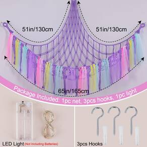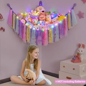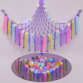 FIOBEE Rede ou rede de animais de pelúcia com luz de LED, rede de brinquedo pendurada para animais de pelúcia, organizador de armazenamento, decoração de quarto com borlas para berçário, sala de jogos, quarto de crianças - Armazenamento de animais de pelúcia pendurados: organizador de brinquedos decorado com borlas de renda coloridas e vem com cordão de luz LED que pode ser utilizado como luz noturna; o armazenamento da sala não apenas mantém os quartos das crianças mais organizados, mas também adiciona uma atmosfera acolhedora ao canto da sala - Economia de espaço: design de pendurar na parede, nossa rede de animais pode ser pendurada em um canto da parede, não ocupa espaço extra; mantém o quarto das crianças arrumado e espaçoso; ideal para berçário, pré-escola, sala de jogos, quarto infantil, grande o suficiente para guardar animais de pelúcia - Material: Nossa rede para bichos de pelúcia é feita de corda tecida à mão premium, não solta ou vaza, o que é durável; equipado com anéis de metal para pendurar; nosso tamanho de suporte de bichos de pelúcia é 100 x 100 x 149 cm - Escolha ideal: a organização do berçário deve ser uma ótima escolha para crianças, aparência bonita e função de armazenamento; e as crianças desenvolverão bons hábitos de armazenamento de brinquedos, é uma ótima maneira de manter animais de pelúcia fofos em exibição - Fácil de instalar: pacote incluído, 1 pacote de rede de animais de pelúcia, luz de cordão de LED, 3 ganchos de peça; é fácil montar o armazenamento de brinquedos infantis no canto do quarto; para evitar virar, mantenha os três ganchos no mesmo nível; não incluindo pilhas