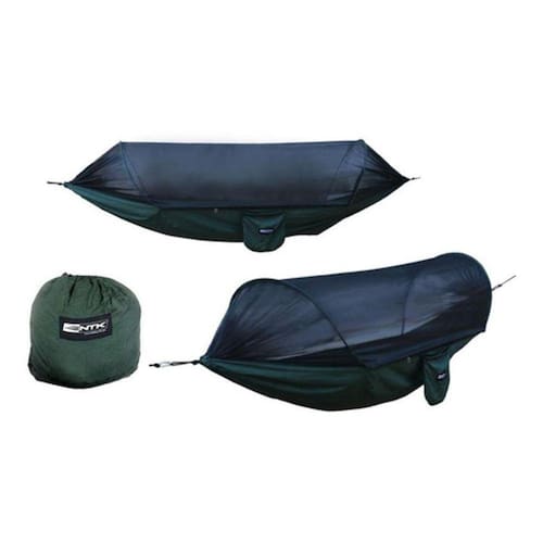 Informações gerais: Material: Rede em poliamida 210T, estrutura em fibra de vidro e mosquetões em aço cromado Medidas: 3 m x 1,45 m Peso suportado: 200 kg Peso do produto: 830 g Cor: Verde Marca: NTK