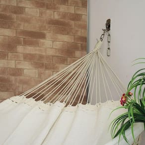 Dimensões: 2,80 m x 1,65 m (só tecido) Dimensões da Madeira : 1.20 m Comprimento Total: 4,20 m ( punho a punho) Peso: +/ 5.000 kg Capacidade Máxima de Carga: 200 kg Composição: 100% Algodão Distância Ideal dos Ganchos: Aprox. 2,,90 a 3,30 m Altura Ideal dos Ganchos: Aprox. 1,90 m