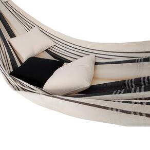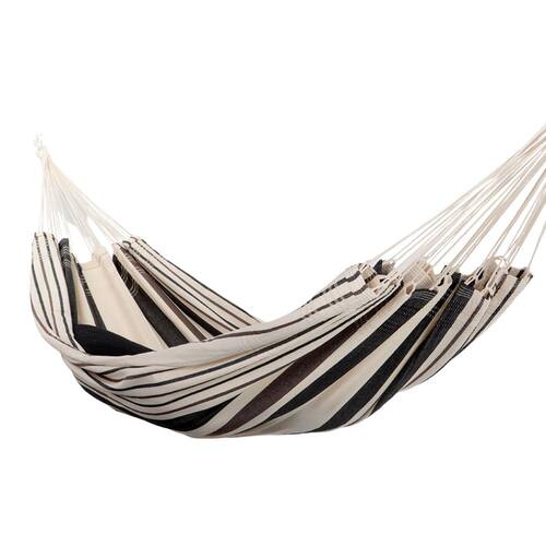 Uma rede de dormir simples e pequena na cor bege com marrom em tom de café para quem procura descanso e lazer ao menor custo, com a garantia de um produto de qualidade. É leve, fácil de transportar, lavar e guardar.