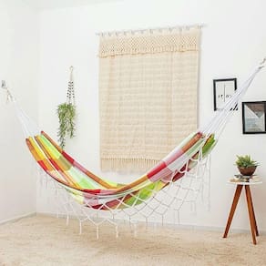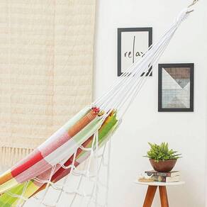 Dimensões: 2,50 m x 1,50 m (só tecido)Comprimento Total: 3,90 m (punho a punho)Peso: +/- 1,600 kgCapacidade Máxima de Carga: 140 kgComposição: 100% AlgodãoDistância Ideal dos Ganchos: Aprox. 2,90 a 3,60 mAltura Ideal dos Ganchos: Aprox. 1,90 m.