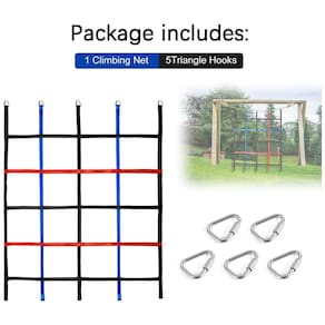 A rede de escalada pode ser facilmente anexada a um conjunto de balanço, playground ou equipamento de playground. Excelente para exercitar a parte física e mental das crianças, melhorando o equilíbrio e a coordenação. Feita de poliéster resistente, durável e resistente ao desgaste, com costura requintada. Os anéis triangulares e os ganchos galvanizados suportam até 250 kg. Adicione essa rede de escalada à sua casa da árvore, playground ou ninja line para tornar a diversão das crianças mais segura e emocionante! Inclui uma rede de escalada de poliéster de alta qualidade e 5 mosquetões triangulares para pendurar. Resistente, seguro e de fácil montagem, com 180cm de altura e 145cm de largura. Ideal para cursos de obstáculos de guerreiro ninja, casa da árvore, balanço e playground ao ar livre. Apropriado para melhorar a força física e mental das crianças, equilíbrio, coordenação e diversão ao ar livre.
