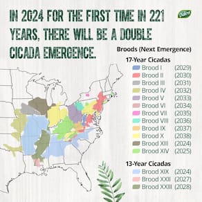 - 2024 é um ano de ninhada dupla: este ano, uma ninhada de cigarra de 17 anos coincidirá com uma ninhada de 13 anos, que promete danificar muitas pequenas árvores e plantas em seu caminho. Cicada-X é a solução ideal para proteger suas plantas valiosas e vegetais preciosos.