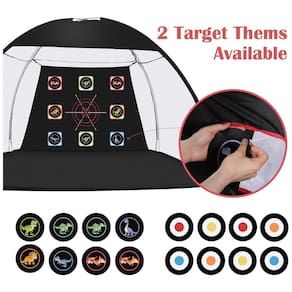 Esta rede possui 9 bolsos de alvo, projetados para oferecer prática de força e precisão em lascar, bater e dirigir o swing. Inclui 8 imagens substituíveis nos bolsos de alvo, proporcionando variedade e desafios adicionais. Dois alvos alternativos, um circular e outro com imagem de dinossauro, são especialmente atrativos para as crianças interessadas em jogar golfe.