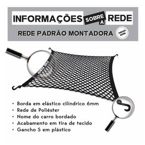 características do produto modelo de rede porta objetos, instalada no piso do porta malas. Impede que os objetos transportados se desloquem involuntariamente, causando ruídos, sujeira ou qualquer problema indesejado, garantindo segurança e organização durante seu trajeto. Informações técnicas do produto borda em elástico cilíndrico 6mm rede de poliéster nome do carro bordado acabamento em tira de tecido gancho s em plástico diâmetro do furo 3 cm