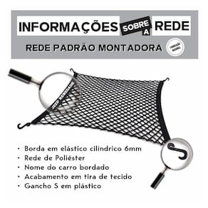 características do produto modelo de rede porta objetos, instalada no piso do porta malas. Impede que os objetos transportados se desloquem involuntariamente, causando ruídos, sujeira ou qualquer problema indesejado, garantindo segurança e organização durante seu trajeto. Informações técnicas do produto borda em elástico cilíndrico 6mm rede de poliéster nome do carro bordado acabamento em tira de tecido gancho s em plástico diâmetro do furo 3 cm