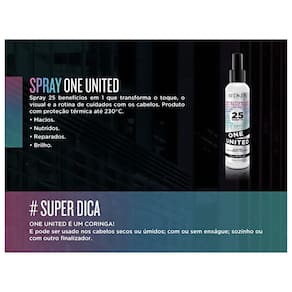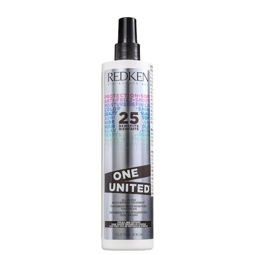 Tratamento Multibenefícios para todos os tipos de cabelo. Redken One United 25 Benefits oferece, como o nome mesmo diz, 25 benefícios instantâneos para fios macios, com brilho, protegidos do calor térmico, sem frizz e com efeito duradouro. Seu poder de reparação faz de Redken One United 25 Benefits um tratamento único de brilho, maciez e reparação, que protege dos danos causados pelo uso do secador e chapinha e repara as carências da fibra capilar. Sua textura leve é rapidamente absorvida pelos fios ao mesmo tempo em que fecha as cutículas para um efeito anti-frizz eficaz e duradouro. Redken One United 25 Benefits oferece a seu cabelo: Maleabilidade: - Condicionamento; - Nutrição; - Diminui a porosidade; - Redução do aspecto seco; - Desembaraço; - Ajuda no fortalecimento; - Permite um corte mais prático. Proteção: - Prepara para o penteado; - Evita a quebra causada pela escova; - Seguro para cabelos coloridos e com ombré; - Proteção térmica; - Previne pontas duplas; - Sela as cutículas; - Protege das agressões externas. Beleza: - Toque sedoso; - Maciez; - Brilho; - Controla o frizz; - Anti-estática; - Deixa a secagem mais rápida; - Renova o visual; - Resultados instantâneos; - Não pesa.