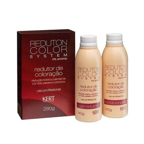 Reduton color system kert Redução total ou parcial da cor dos cabelos coloridos. 0% de amônia reduton color system age através da combinação do gel redutor com o creme condicionador, formando uma composição que possibilita remover do interior da fibra capilar os corantes depositados através do processos oxidativos (colorações permanentes e semipermanentes) a remoção da cor se dá por meio de suave redução dos corantes artificiais não alterando a melanina natural dos cabelos. Difere dos descolorantes à base de said de amônia e oxidantes, que removem os corantes artificiais e os naturais também.Em cabelos com colorações muito escuras e intensas, a remoção total da cor será obtida através de mais de uma aplicação. Recomenda-se 'sempre' fazer o teste de mechas e a prova de toque para avaliação prévia do resultado desejado. É compatível com cabelos que passaram por processos químicos como: alisamentos, relaxamentos, escovas progressivas, colorações e descolorações. Não remove a cor de colorações à base de sais metálicos, hennas, hennês, colorações progressivas e temporárias. Qual é a frequência de uso Aguarde um intervalo de 1 semana entre as aplicações. Modo de usar: use luvas adequadas. Coloque em um recipiente plástico uma parte do gel redutor reduton e acrescente igual parte do creme condicionador reduto, (quantidades estas suficientes para aplicação no cabelo a ser corrigido), misture com um pincel plástico até obtenção de uma mistura homogênea; divida o cabelo em mechas; respeite a distancia de 1 cm da raiz e aplique a mistura com o pincel, mecha a mecha no cabelos secos, não precisam estar limpos. Tempo de pausa de 30 minutos após a aplicação; após o tempo de pausa, lavar os cabelos com shampoo neutro kert e enxaguar abundantemente; caso opte por maior redução de cor faça uma nova mistura e reaplique sobre as mechas, deixando pausar por mais 30 minutos; o tempo total de pausa das duas aplicações não deve exceder 60 minutos; não utilizar toucas plásticas, toucas de alumínio ou aquecimento de qualquer espécie durante a aplicação.Kit contém:01 creme condicionador reduton color 140g01 gel redutor reduton color 140g