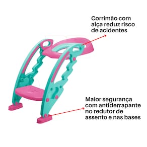 "- ADEQUADA PARA QUALQUER TIPO DE ASSENTO SANITÁRIO '- EQUPADO COM BORRACHA ANTI-DERRAPANTE NO REDUTOR DE ASSENTO E NAS BASES PROPORCIONANDO MAIS SEGURANÇA E REDUZINDO O RISCO DE ACIDENTES '- ""CORRIMÃO"" COM SEGURADOR PROPORCIONANDO MAIS SEGURANÇA E REDUZINDO O RISCO DE ACIDENTES - ALTURA AJUSTÁVEL DE ACORDO COM A ALTURA DA CRIANÇA - ASSENTO ENCAIXA BEM EM TÁBUAS DE DIVERSAS ALTURAS. BASTA APENAS SELECIONAR O MELHOR ÂNGULO DE ENCAIXE '- FÁCIL INSTALAÇÃO/MONTAGEM '- CONTÉM CHAVE PARA ROSQUEAR OS PARAFUSOS - DOBRÁVEL E FÁCIL DE ARMAZENAR '- DESIGN BONITO E DURÁVEL '- POSSIBILITA A CRIANÇA DE UTILIZAR ASSENTOS SANITÁRIOS DE ADULTOS, EM QUALQUER SITUAÇÃO '- MATERIAIS NÃO TÓXICOS (LIVRE DE BPA)"