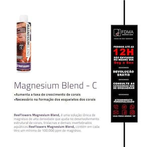 Reeflowers Magnesium Blend, é uma solução iônica de magnésio de alta densidade que ajuda no desenvolvimento estrutural de corais, tridacnas e demais invertebrados aquáticos. Reeflowers Magnesium Blend, contém em cada litro um mínimo de 100.000 ppm de magnésio. Instruções de Uso Todo aquário possui um diferente nível de consumo de magnésio. Antes de utilizar este produto meça o nível de magnésio de seu aquário utilizando um kit de teste apropriado. Utilizar no máximo 20 ml da solução para cada 100 litros de água por dia, até que se chegue ao nível desejado de magnésio 1 ml da solução promove um aumento de 1 ppm de magnésio para cada 100 litros de água do aquário . Uma vez que o nível desejado for atingido, realizar testes de água periódicos em seu aquário para determinar o nível de consumo de magnésio do seu aquário; esta solução pode ser Utilizado diariamente ou semanalmente, se necessário. Se o consumo diário de magnésio do seu aquário for maior que 5 ppm, recomendamos que a solução seja administrada através de uma bomba dosadora. Ean: 8680716330244