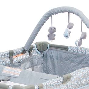 Possui colchão removível, prático trocador com cinto de segurança, bolsa para transporte, pés com rodízios e móbile com tartaruguinhas de pelúcia, que diverte as baixinhas e estimula o desenvolvimento da coordenação motora.