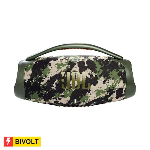 Acabamos de tornar a nossa mais poderosa caixa de som Bluetooth portátil ainda melhor. A silhueta icônica da JBL Boombox 3 tem uma nova e ousada atualização com uma alça de metal resistente e partes em silicone, tampas laterais duplas e tecido exclusivo à prova d'água e à prova de poeira. Ela também foi redesenhada por dentro, acrescentando um novo subwoofer que reproduz graves muito mais profundos e o potente JBL Original Pro Sound, tudo sem qualquer sinal de distorção e 24 horas de reprodução levam você desde o treino matinal até um fim de noite com seus amigos. E para um som praticamente ilimitado, conecte instantaneamente várias caixas de som com o aplicativo JBL Portable.