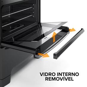 O forno possui grande capacidade e luz interna, com cantos arredondados que não deixam a sujeira acumulada e vidro interno removível para uma faxina mais completa. As grades em aço revestido não deixam a gordura grudar.