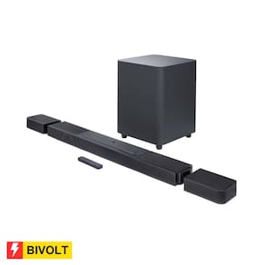 Com 585 watts RMS de potência total no sistema, a JBL Bar 1300 transforma seus filmes, músicas e jogos em experiências sonoras imersivas, colocando você no meio da ação. Um poderoso subwoofer sem fio de 12 polegadas com graves vibrantes e precisos que trazem empolgação aos seus filmes e emoção à sua música.