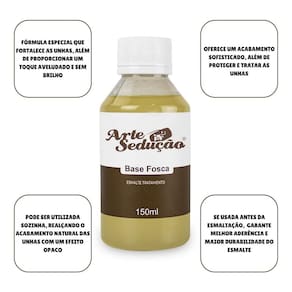 Contém: 01 - Esmalte Tratamento Base Fosca, 150ml, Arte Sedução A Base Fosca da Arte Sedução foi desenvolvida para oferecer um acabamento sofisticado, além de proteger e tratar as unhas. Sua fórmula especial cria uma película resistente que fortalece as unhas, além de proporcionar um toque aveludado e sem brilho. Perfeita tanto para quem gosta de um visual fosco quanto para profissionais que buscam uma base de alta qualidade para preparação das unhas. Pode ser utilizada sozinha, realçando o acabamento natural das unhas com efeito opaco, ou como base preparatória para esmaltação, garantindo melhor aderência e maior durabilidade dos esmaltes. Com a embalagem econômica de 150ml, oferece um excelente rendimento, sendo ideal para em salões ou para quem deseja cuidar das unhas em casa com qualidade . Características Principais: - 150ml; - Acabamento fosco e elegante; - Protege e trata as unhas; - Fórmula especial que cria uma película resistente que fortalece as unhas; - Toque aveludado e sem brilho; - Perfeita para quem gosta de visual fosco; - Indicada para profissionais que buscam uma base de alta qualidade para preparação das unhas; - Pode ser utilizada sozinha ou como base preparatória para esmaltação; - Se utilizada sozinha, realça o acabamento natural das unhas com acabamento opaco; - Excelente custo-benefício. Marca: Não Informado Ean: 7899531424170