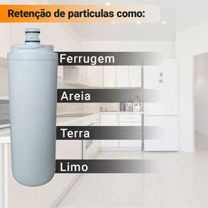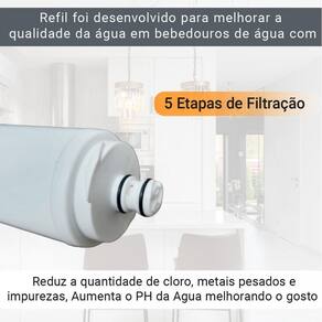 Refil com 5 etapas de filtração: 1- polipropileno 5 micras, 2- dolomita, 3- polipropileno 15 micras, 4- carvão, 5- polipropileno 15 micras. Remove impurezas, reduz cloro livre e possui eficiência bacteriológica.Tipo
