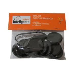 Precisa colocar mais folhas no seu Caderno Inteligente Compre um pacotinho de discos G 31mm Suporta até 150 folhas 90g ou 120 folhas 120g. O kit contém 12 discos e acompanha um elástico preto