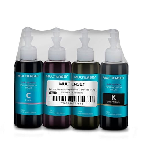 Marca: Multi Modelo: Kit Refil de Tinta c/ 4 Cores p/ Impressoras Epson 100ml Multi - RF031 Cores: Preto, Ciano, Magenta e Amarelo. Compatibilidade: Toda as Impressoras Epson com tanque de tinta. Volume da unidade: 100ml Largura do produto: 4.2cm Altura do produto: 16.8cm Comprimento do produto: 13.18cm Peso do produto: 472.000g Conteúdo da embalagem: 1x Kit Refil de Tinta c/ 4 Cores p/ Impressoras Epson 100ml Multi - RF031 Garantia: 1 anos