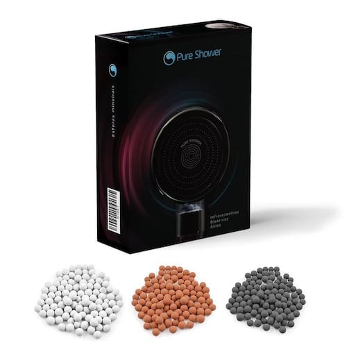infravermelhos na cor ocre , que atuam no processo de filtragem e purificação da água. Nions na cor cinza , que transformam as moléculas de água em partículas de fácil absorção, promovendo a melhora do metabolismo celular. Bioativos na cor branca , que promove o balanceamento do ph e facilita a hidratação e brilho. No container está incluso o filtro por barreira, fabricado em algodão e polipropileno, que finaliza a ação de purificação da água para o tratamento capilar. O kit pode ser utilizado como conversão do modelo antigo da pure shower que não possui as brancas para o modelo atual com as brancas . Kit de minerais para reposição conjunto com 3 tipos de minerais, listadas abaixo: