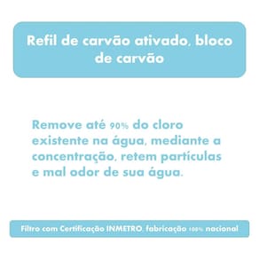 Retenção minima de 75% do cloro da água, podendo variar mediante a concentração existente na água. Filtro de acordo com a norma nbr 16098.